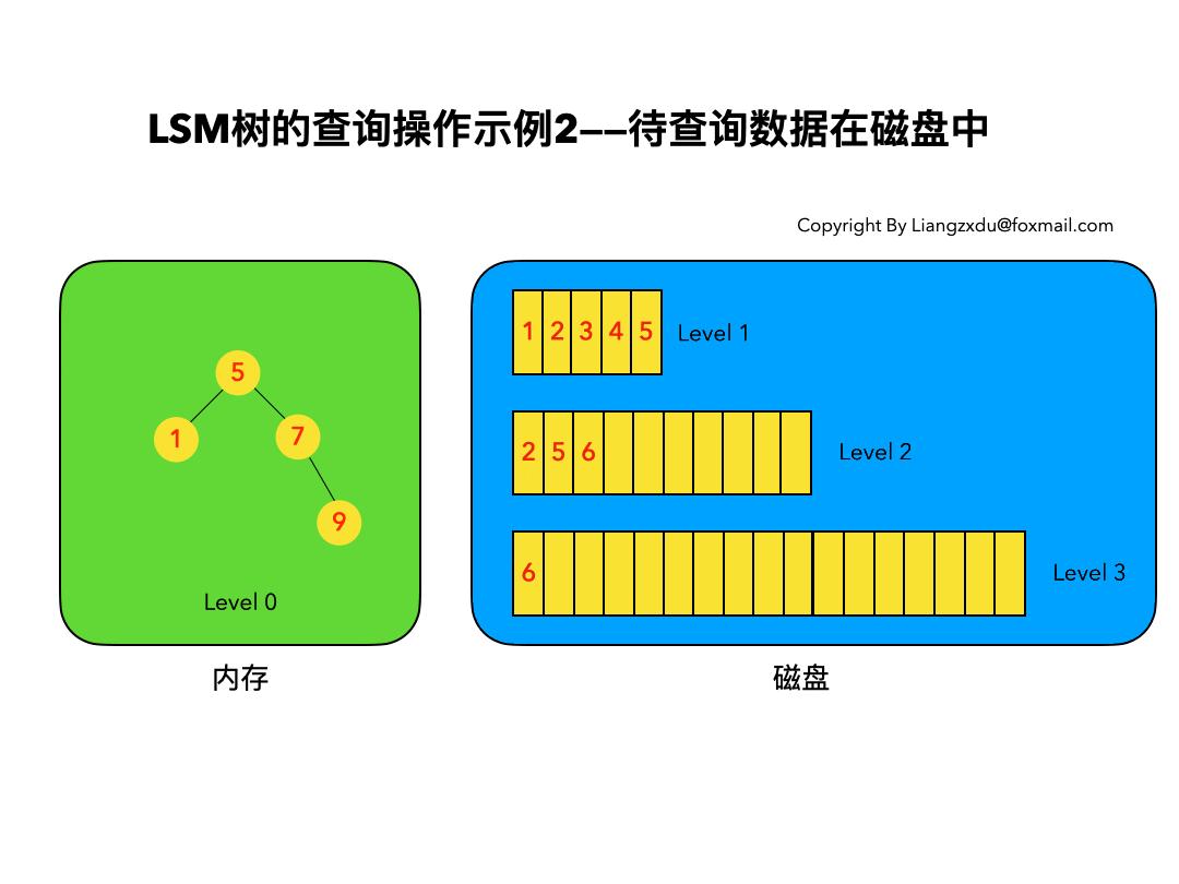 先查询内存中的Level 0树,没查到便查询磁盘中的Level 1树,还是没查到,于是查询磁盘中的Level 2树,匹配后返回key=6的数据。