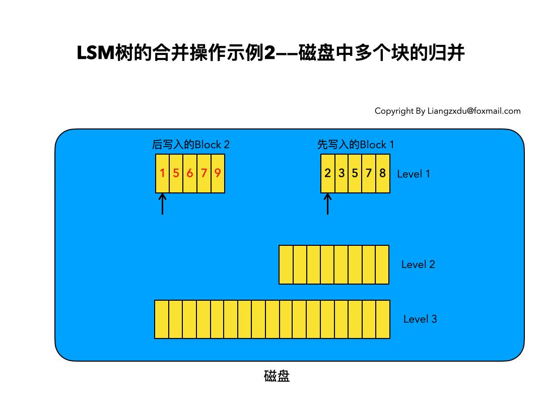 如图10所示,该图展示了磁盘中Level 1层达到阈值时,对其包含的两个Block块进行归并,并将归并结果写入Level 2层的过程。