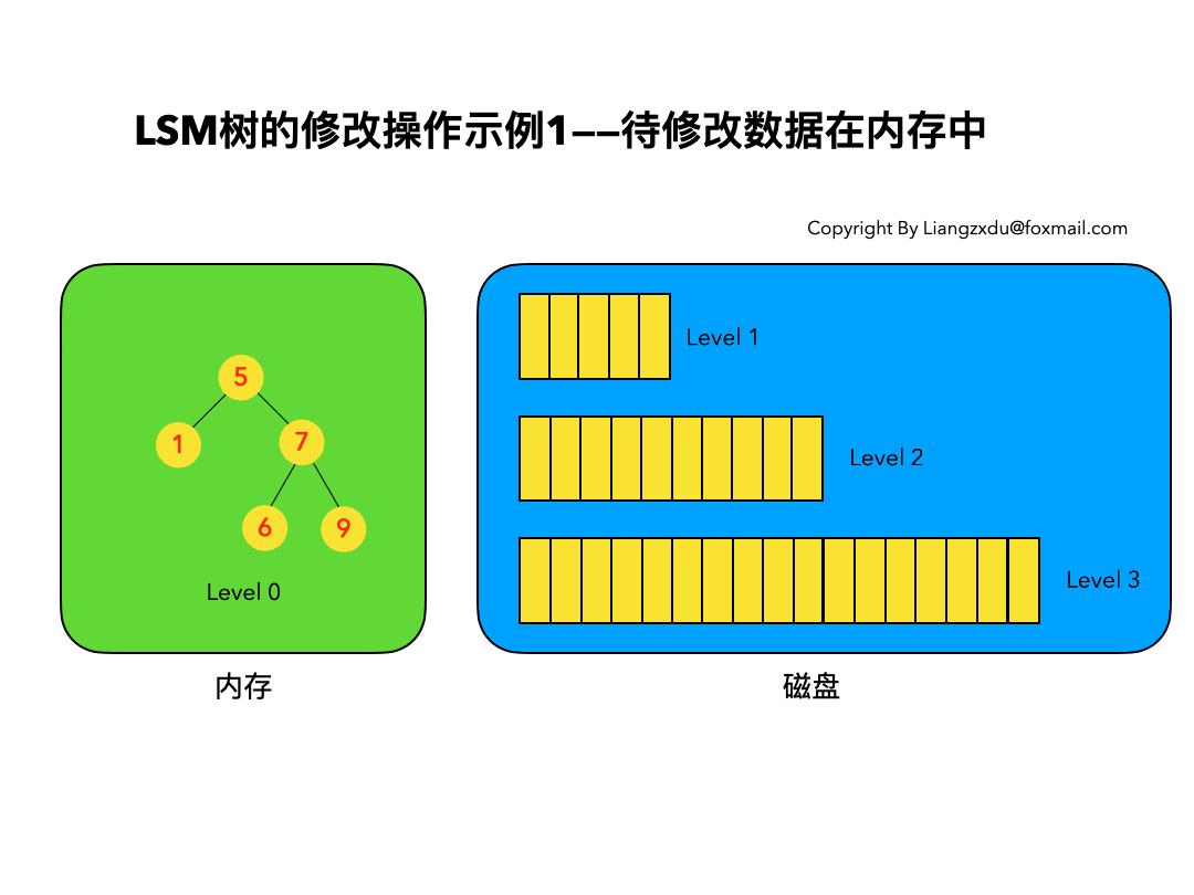如图6所示,展示了待修改数据在磁盘中的操作过程。LSM树并不会去磁盘中的Level 1树上原地更新老的key=7的数据,而是直接将新的蓝色的节点7插入内存中的Level 0树中。