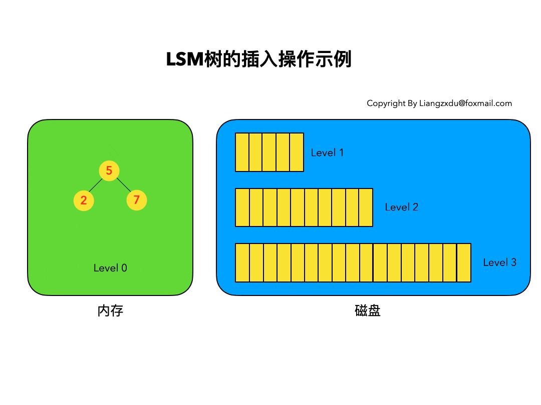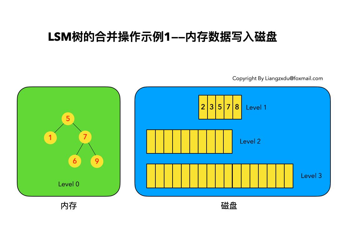 - 图1左侧绿色的内存部分中Level 0是一颗二叉排序树(定义3)。注意这里的有序性,该性质决定了LSM树优异的读写性能。