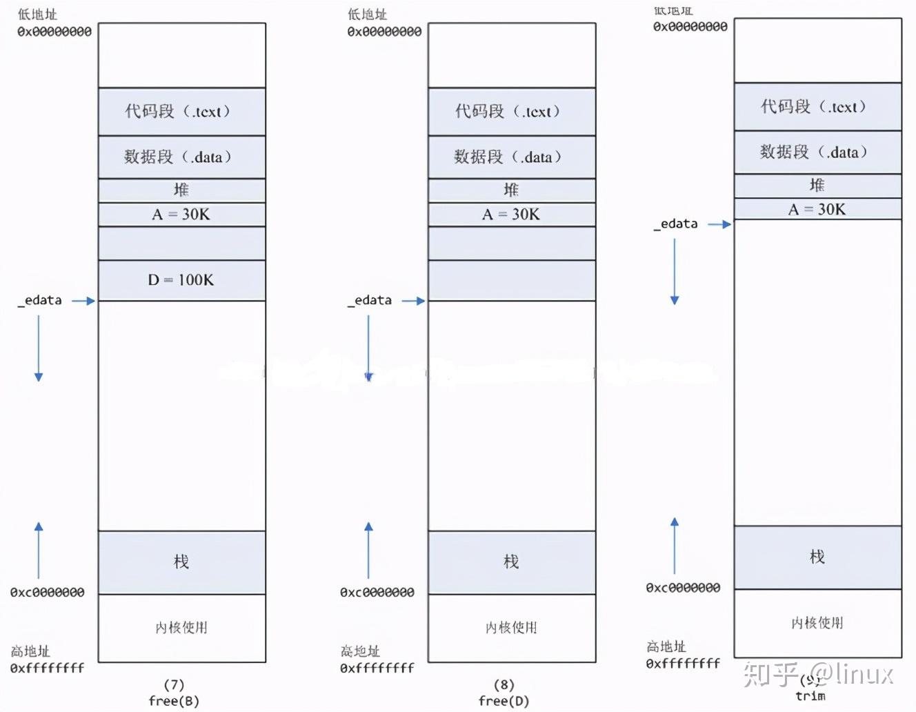 B对应的虚拟内存和物理内存都没有释放,因为只有一个_edata指针,如果往回推,那么D这块内存怎么办呢?
