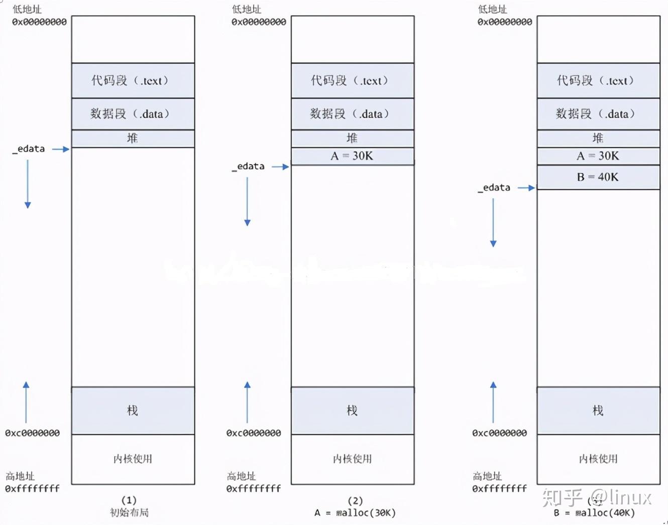 malloc函数会调用brk系统调用,将_edata指针往高地址推30K,就完成虚拟内存分配。