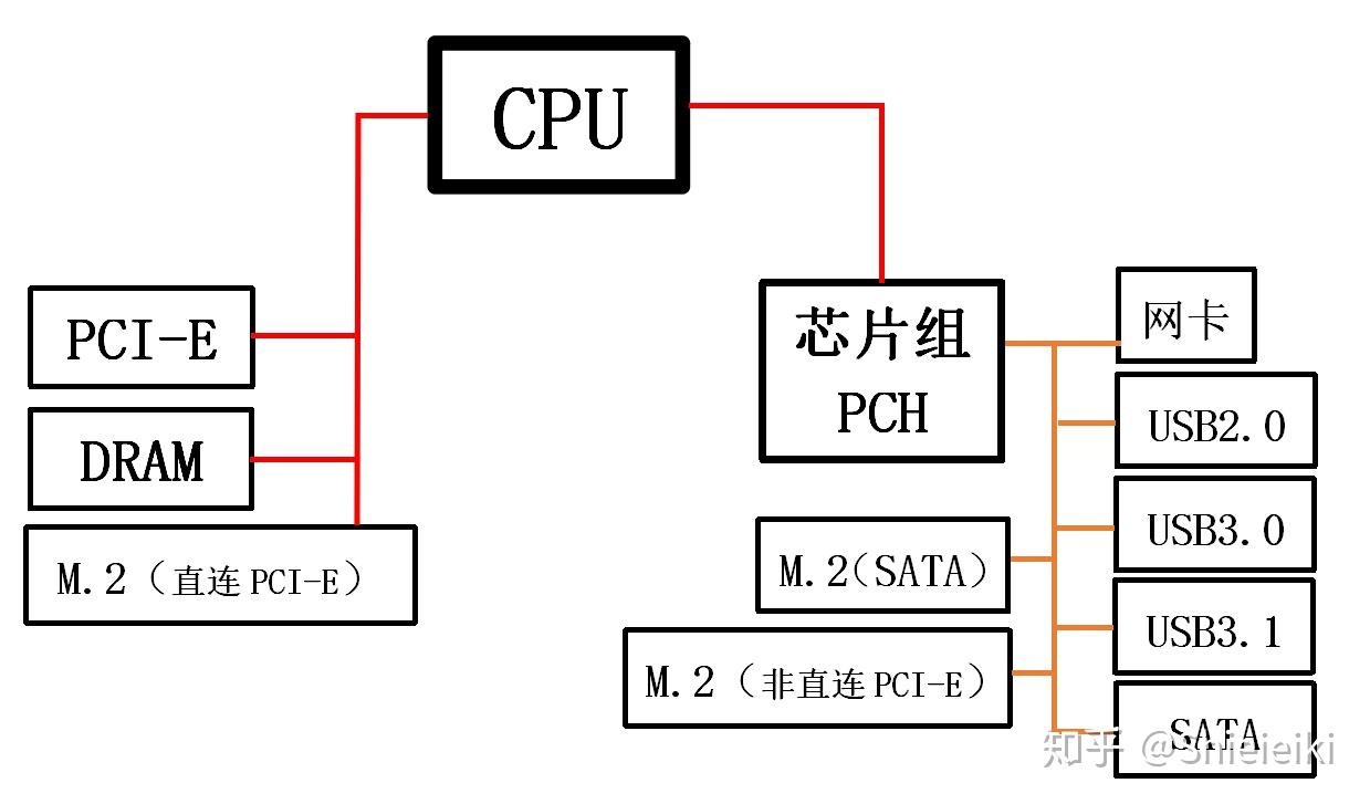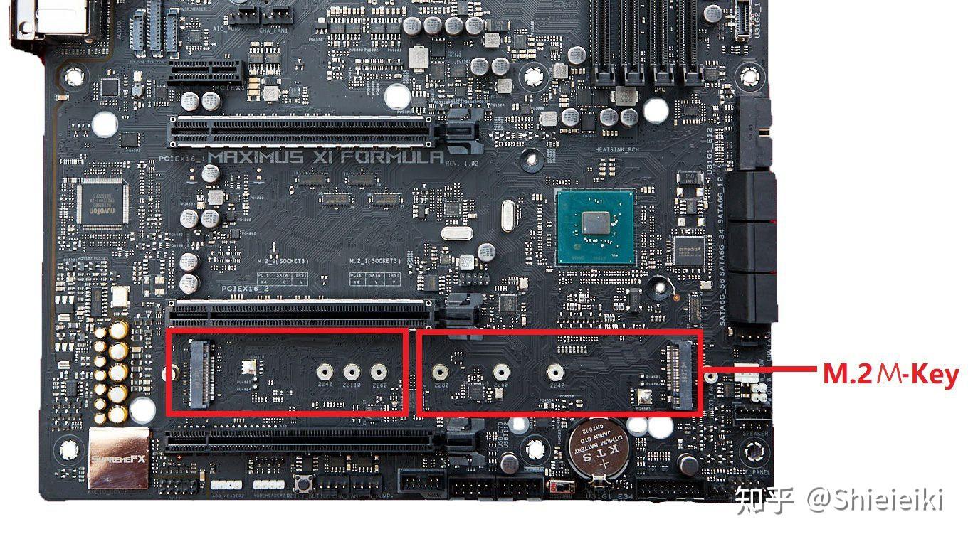 M.2主要作用就是安装固态硬盘,他也可以装M.2接口的无线网卡。M.2接口的形状非常好认,如果你想确定你的主板能装几个M.2固态只需要看一下主板的图片就知道了,M.2固态接口分为B-KEY和M-KEY两种,目前的绝大多数主板都是M-KEY的,都是走PCIEX4(PCH)通道的。关于B-KEY和M-KEY的区别大家可以看这个文章:Shieieiki:【如何挑选一块合适的固态硬盘】