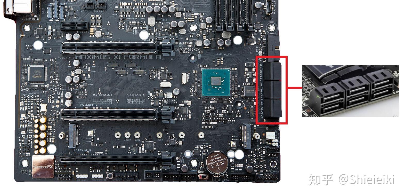 这个接口主要就是接SATA接口的机械硬盘或者SATA接口的固态硬盘,每个SATA都有自己的编号,注意有的SATA口会和M.2接口冲突,一旦M.2上存在设备某个SATA就会被屏蔽,所以这里如果你碰见机械盘读取不出来,看看是不是发生了冲突,这时候换个SATA接口就行。