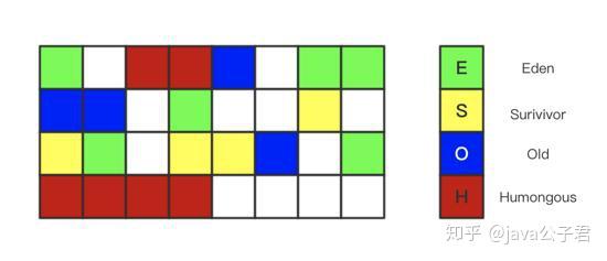 来解释一下这个图,G1垃圾回收器,会把你的堆内存分为 大小相等 的独立区域(Region),JVM最多可以分配2048个Region,一般Region大小等于堆大小除以2048,比如堆大小为4096M,则Region大小为2M,当然也可以 用参数"-XX:G1HeapRegionSize"手动指定Region大小,每个Region的状态不确定,可能是Eden区域,也可能是Old区域,不需要原有的联系设置,这里说一下以前没有提到的Humongous区域,他是用来存储大对象的,大对象的判定规则就是一个大对象超过了一个Region大小的50%,比如按 照上面算的,每个Region是2M,只要一个大对象超过了1M,就会被放入Humongous中视对象大小而定格子的连续数目。